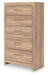 The natural wood tones and clean lines of this chest of drawers echo your easygoing style sensibilities. With a warm finish and replicated oak grain, its carefree character lightens up your bedroom. Curved inner corner details soften the look, while sleek bronze-tone hardware modernizes the feel.