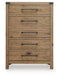 Rustic character with a dash of refinement. Outfitted with stunning hickory veneer and completed with a natural finish, this chest of drawers celebrates the authentic beauty of wood. Its sturdy silhouette, complete with a thick top and posts, lends a substantial, luxurious weight to the look. Metal accents introduce an industrial-inspired flair.