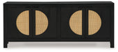 Bring high style and functionality to your home with this contemporary accent cabinet. Woven cane door fronts and a contrasting black finish bring the wow factor to this mid-century inspired piece. Whether it suits your storage needs in the dining room, home office or entryway, it's quite a showpiece.