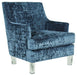 This accent chair with shelter arm styling merges contemporary and traditional styling in the most beautiful way. The combination of polyester crushed velvet upholstery and tapered clear acrylic legs makes for one cool contrast. Combining comfort and fashion-forward design for the modern enthusiast.
