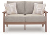 Natural neutrals are all the rage. Embrace the style trend with this outdoor loveseat. Crafted of MEGA-TUFF® HDPE material, this chair combines the exceptional durability and weather resistance you need with the wood look you love. Comfy cushions wrapped in our high-performing, low-maintenance Nuvella® fabric offer stylish and durable appeal, taking outdoor living to a whole new level. Coordinating accent pillows add a wonderful layer of interest.